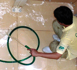 - 専用洗剤を床に塗布し、デッキブラシで洗浄する(油汚れの場合は、油汚れ用洗浄剤を使用)